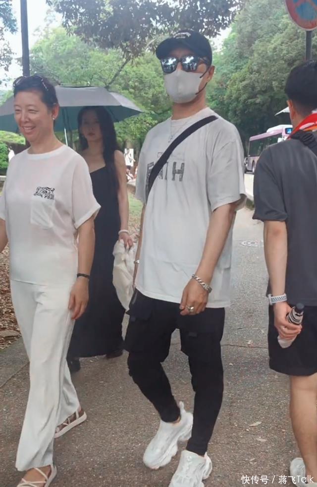 这天汪峰穿着白色的T恤搭配黑色裤子,身上斜挎着一个黑色的包包,打扮依然一如既往。虽然其他人都袒露真容,只有汪峰戴着帽子眼镜和口罩将面部遮挡得严严实实,但汪峰实在太有辨识度,他一人走在前面,还时不时看看身后的队伍。