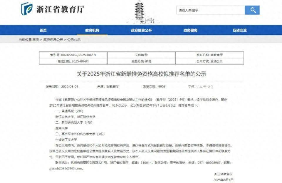 8月1日牛牛配,浙江省教育厅在官网公布了《关于2025年浙江省新增推免资格高校拟推荐名单的公示》,拟推荐4所高校新增推免高校资格。