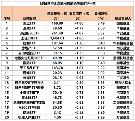 从单日资金净流出排行看,军工ETF、游戏ETF、红利ETF、房地产ETF等主题ETF成为“失血”大户。