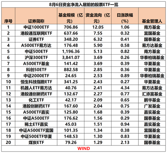 8月6日,A股三大股指集体收涨,军工、机器人产业链全线走强,股票ETF整体资金净流入超71亿元,中证1000ETF、A500ETF、中证500ETF、沪深300ETF等宽基ETF产品成为“吸金”主力,军工、游戏、红利、房地产等主题ETF成为“失血”大户。