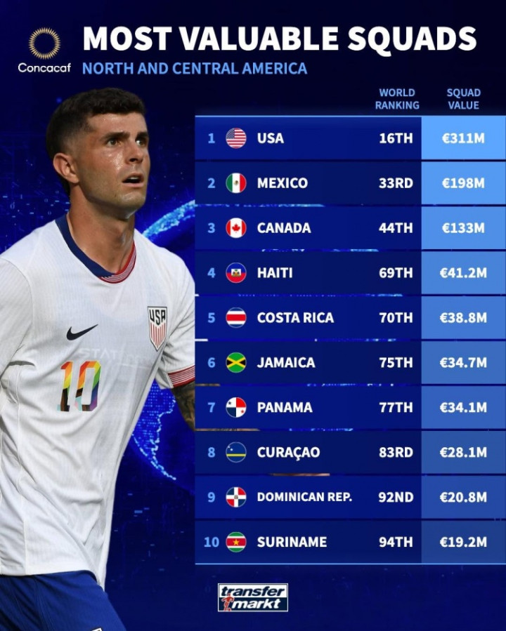 直播吧10月12日讯德国转会市场网公布中北美及加勒比海足联国家队身价排名,美国队以3.11亿欧元总身价位居榜首,墨西哥(1.98亿欧元)与加拿大(1.33亿欧元)分列二、三位。